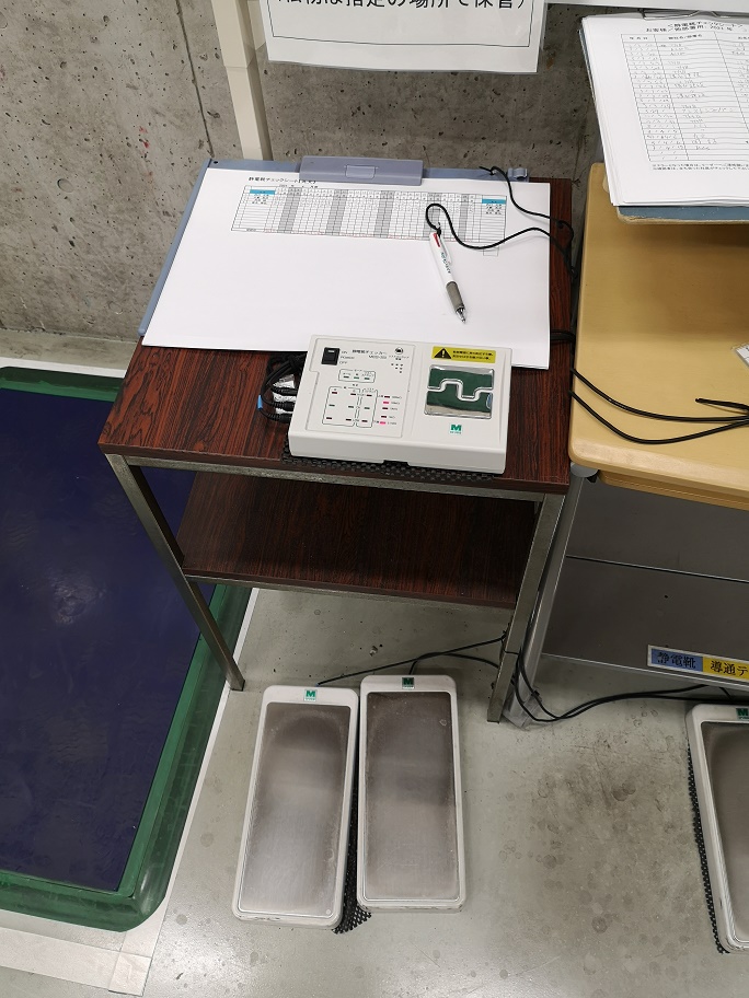 なので、着ている作業着も静電気を通しづらい素材をしようしたものを着用し、倉庫内に入る際には入り口で静電靴に履き替え静電チェッカーにてチェックも行っています。もちろん床も作業台も静電対策がされており、作業をする際にはリストバンドをつけて作業を行います。
