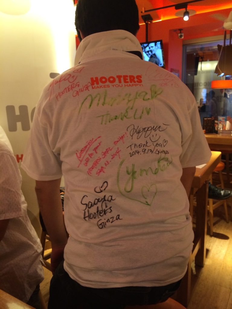アメリカで好きだったのよ。フーターズ。バックにサインを書いてもらっているのはたけちゃんです。みんなにカンパしてもらい買ってきせました(笑)