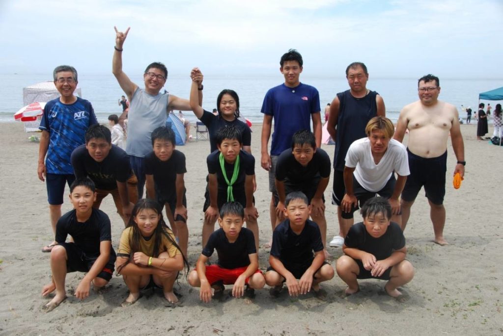 と言っても、例年は2泊3日で最終日に海に行くのですが、今年は1泊2日で2日目も試合予定でしたので水着等は持ち物にありません。みんな短パンやアンダーシャツ等にて海へ。最初は足のみ浸かり波打ち際で遊んでいましたが、一人押されて海に入ったら全員がびしょ濡れになりました。