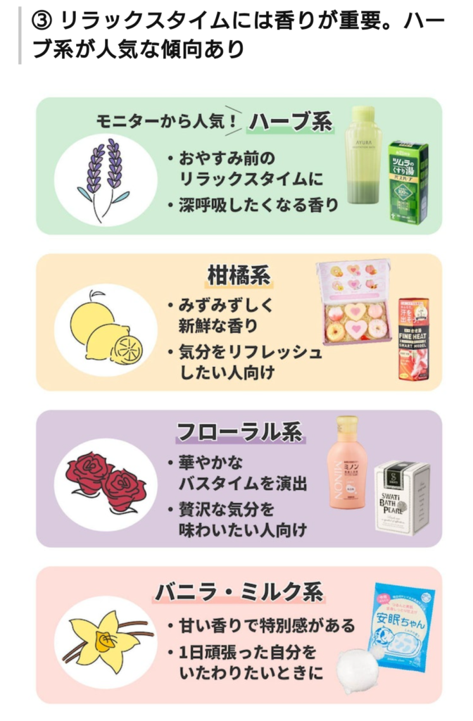 各家庭、効能や気分で選んで入れるって感じで、種類はバラエティに飛んでましたね〜。