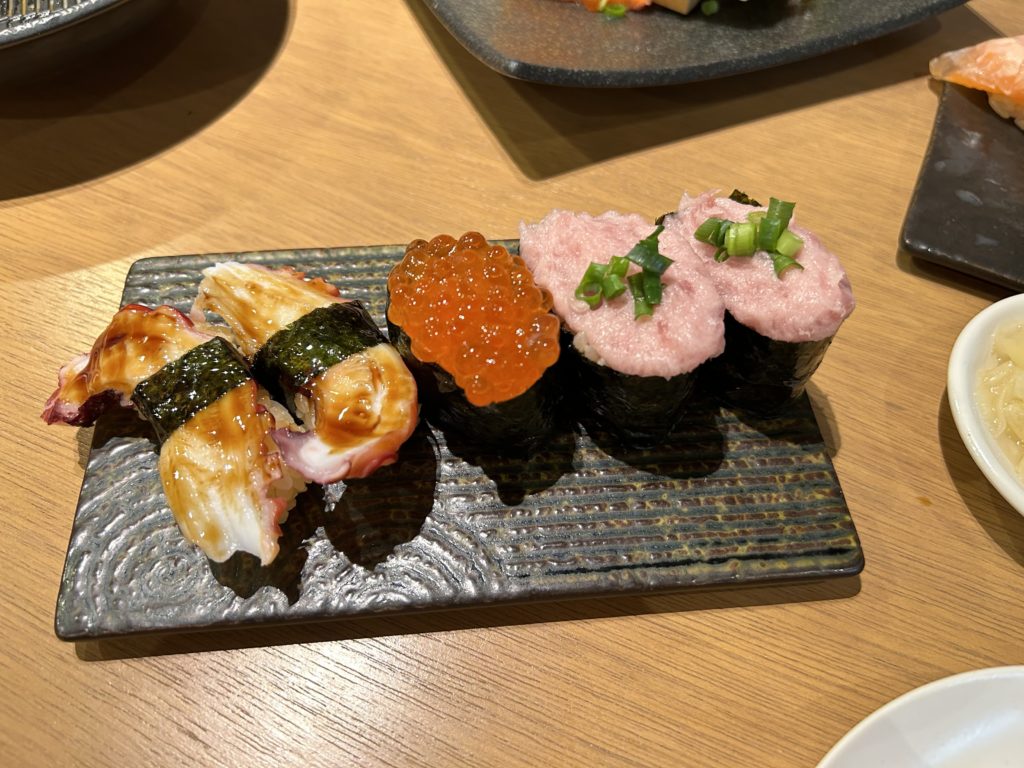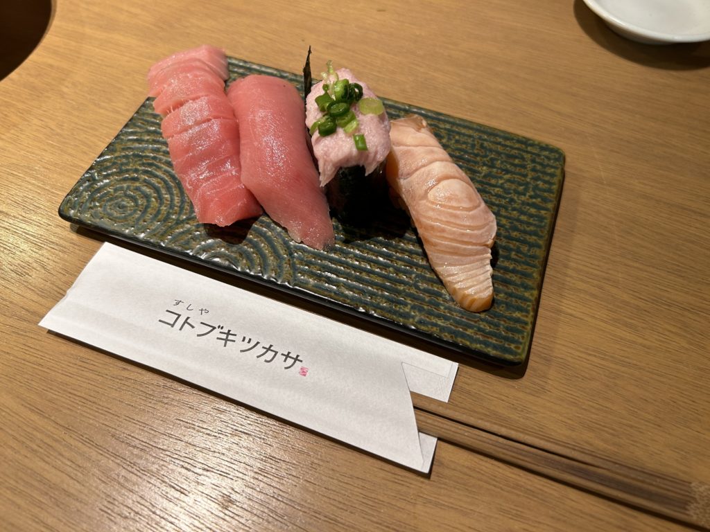 子供が注文したマグロ🍣おすすめ3貫はこんな感じです。右は炙りサーモンです。