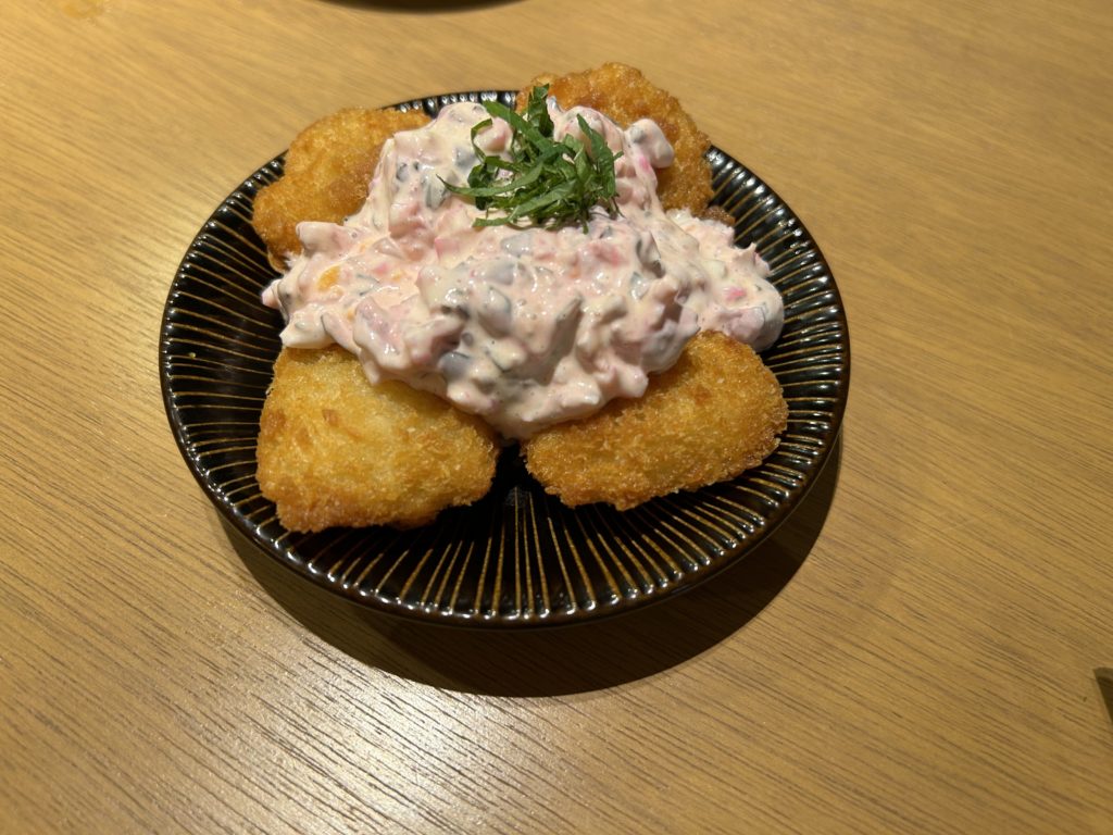 あとね、うちの妻が注文したイカフライしば漬けタルタル❗️すげぇ、美味い。しば漬けとタルソーがこんなにも合うとは‼️ 色見もピンクで春っぽいでしょ?(笑)新鮮で柔らかいイカに加えて、しば漬けのたまらん食感、アーンド、くどくないタルタルでサッパリと。お口の中が宝石箱になります。