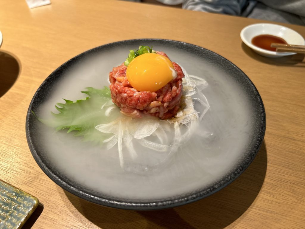 目でも楽しめるようにしてくれていて、和牛ユッケは冷えたままが美味しく温まらないようにとの説明を加え、客席にて店員さんがドライアイスサービスしてくれます❗️