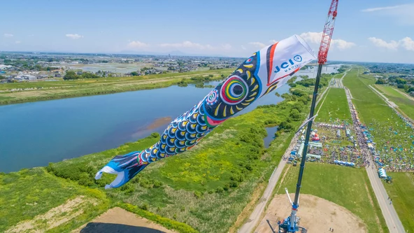 日本有数のこいのぼりの産地ということもあり、メイン会場の「利根川河川敷緑地公園」では、全長約100m・重さ約330kg“ジャンボこいのぼり”が掲揚されます。