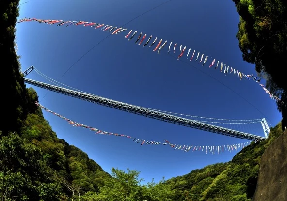 ダム湖畔の遊歩道から見上げる「竜神大吊橋」とこいのぼりも絶景