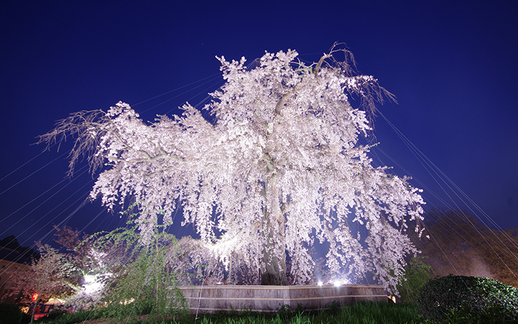 我々が行った時間は日没直後頃で「宵の枝垂れ桜」といった感じで、ちょうどスポットライトが点灯して得も言われぬ煌びやかさを覚えています。